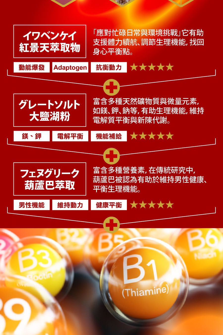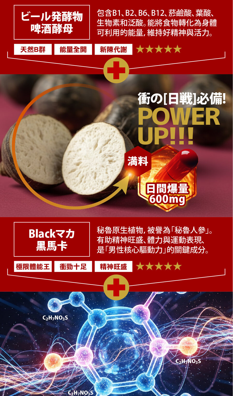 主要成分:啤酒酵母發酵物(啤酒酵母粉、菸鹼酸、本多酸鈣、維生素B1、維生素B2、維生素B6、生物素、葉酸、維生素B12)、牛磺酸、紅景天、黑馬卡、葫蘆巴、大鹽湖粉...等。/保存期限:二年。/有效期限:請見外包裝說明(西元年/月/日)/原產地:台灣。/保存條件:請放置陰涼乾燥處,並避免高溫及陽光直射,並放置高處防止兒童拿取。