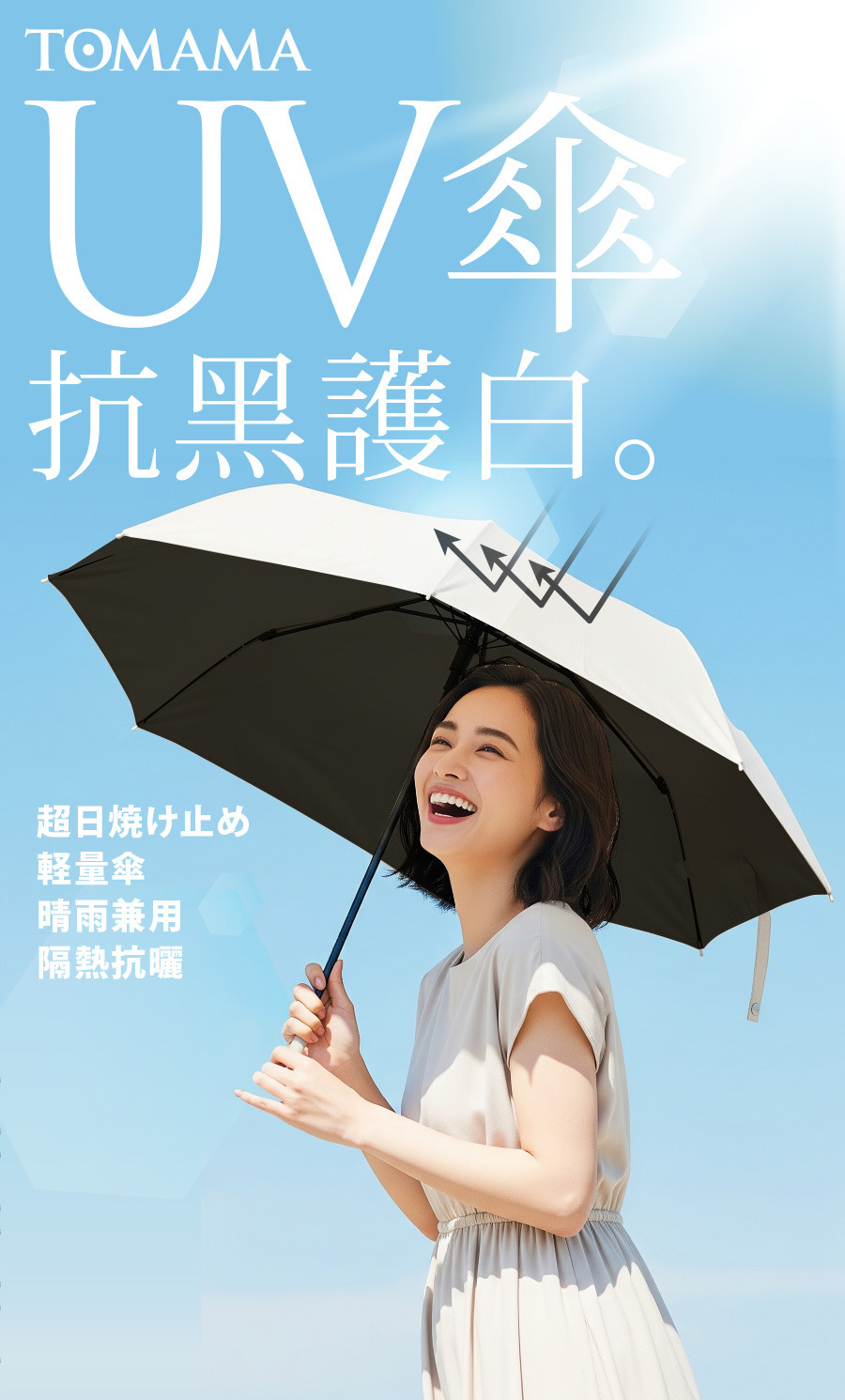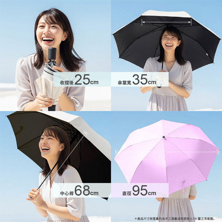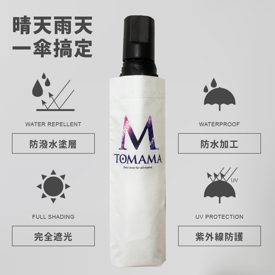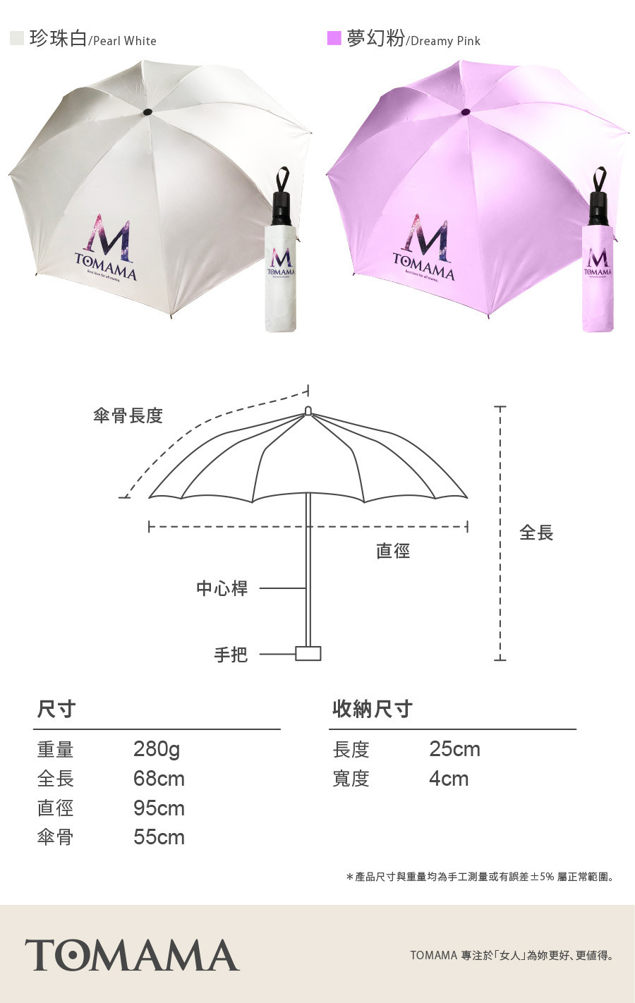 【商品資訊】 品名:TOMAMA | 抗UV反向晴雨兩用折疊傘/顏色:珍珠白/夢幻粉。 開傘尺寸:傘面直徑95cm、傘骨55cm、全長68cm、重量280g。/收納尺寸:25cm*4cm。/材質:傘骨鐵、傘架鋼。